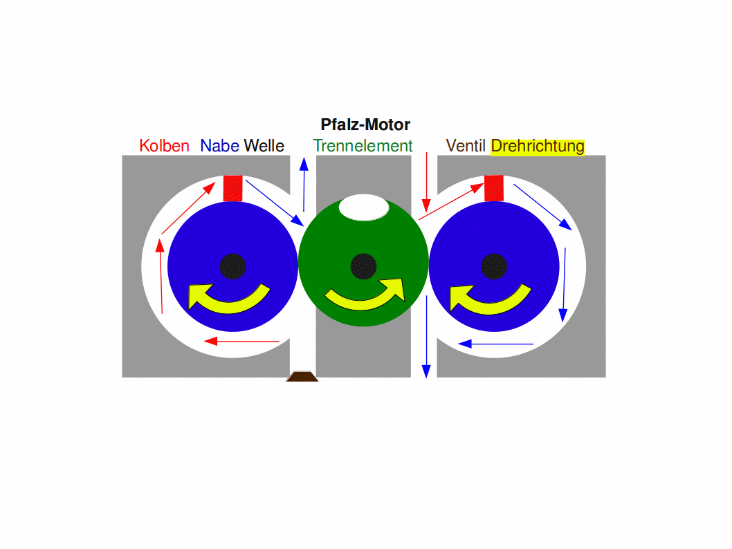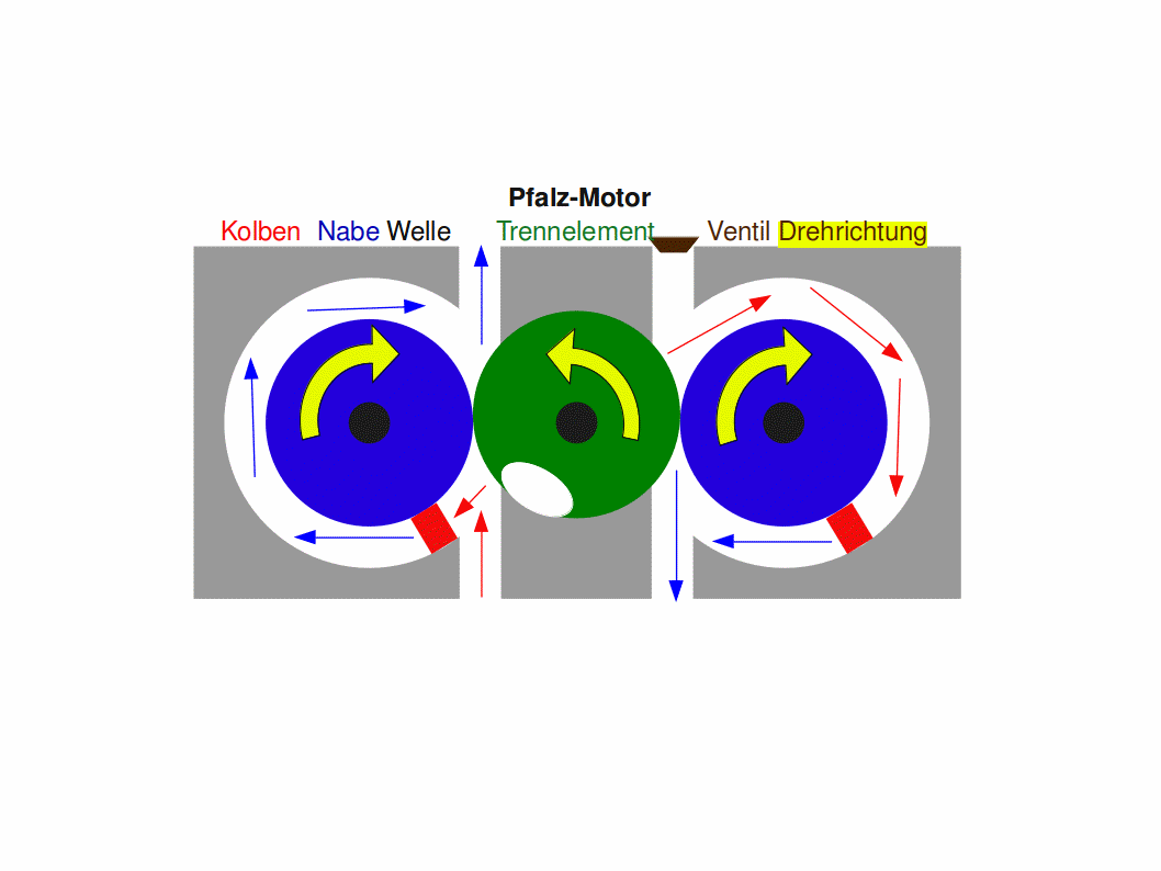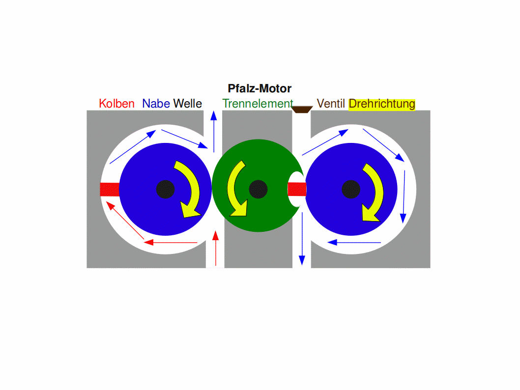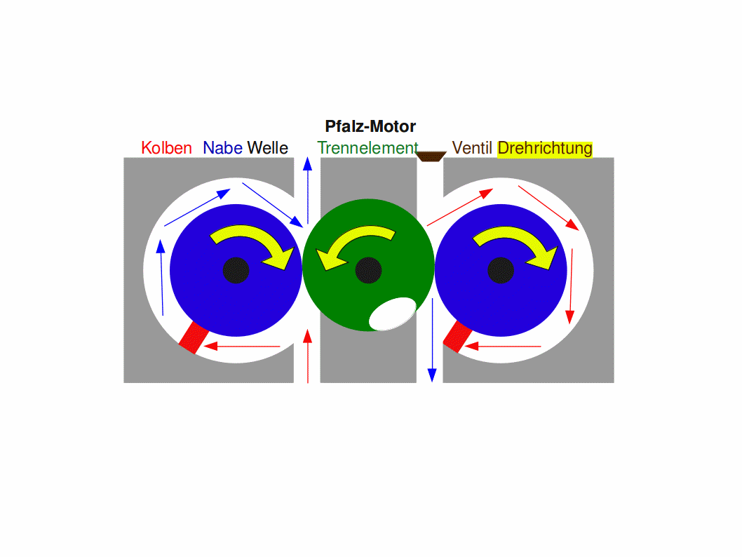 Der Pfalz-Verbrennungsmotor arbeitet schon in der gewünschten radialen Drehbewegung.                      Nur dieser Motor arbeitet schon in der gewünschten Rotation!